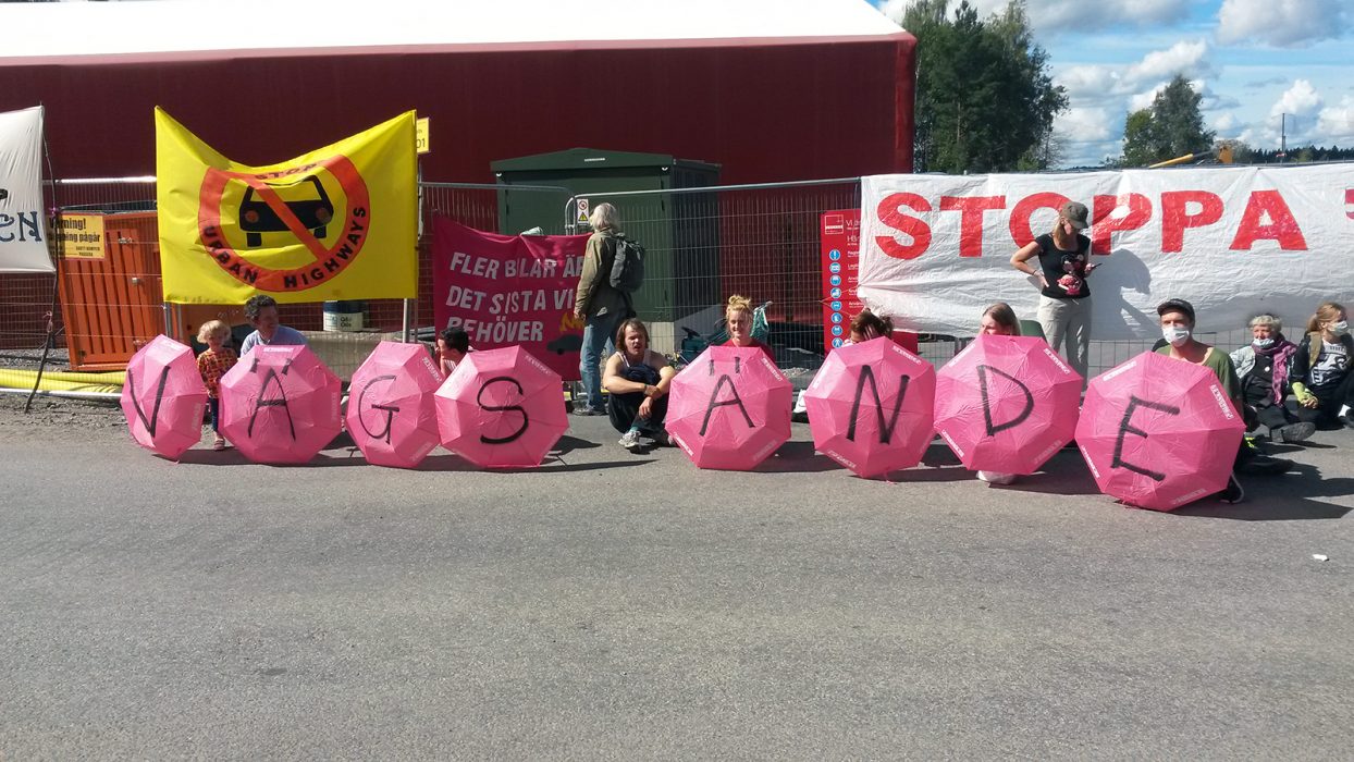 Där satte de sig ner på marken för att blockera grindarna till byggarbetsplatsen. Demonstrationen anordnades av nätverket Vägs ände.