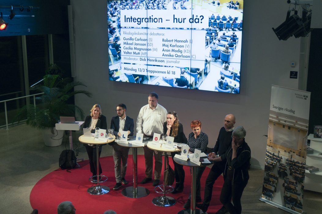 Många hade samlats på Stadsbibliotekets trappscen för att höra när riksdagsledamöter debatterade integration i måndags. På plats för de olika partiernas räkning var Gunilla Carlsson (S), Robert Hannah (L), Mikael Jansson (SD), Maj Karlsson (V), Cecilia Magnusson (M), Aron Modig (KD) och Annika Qarlsson (C). Miljöpartiet fanns inte representerat på grund av ett återbud.