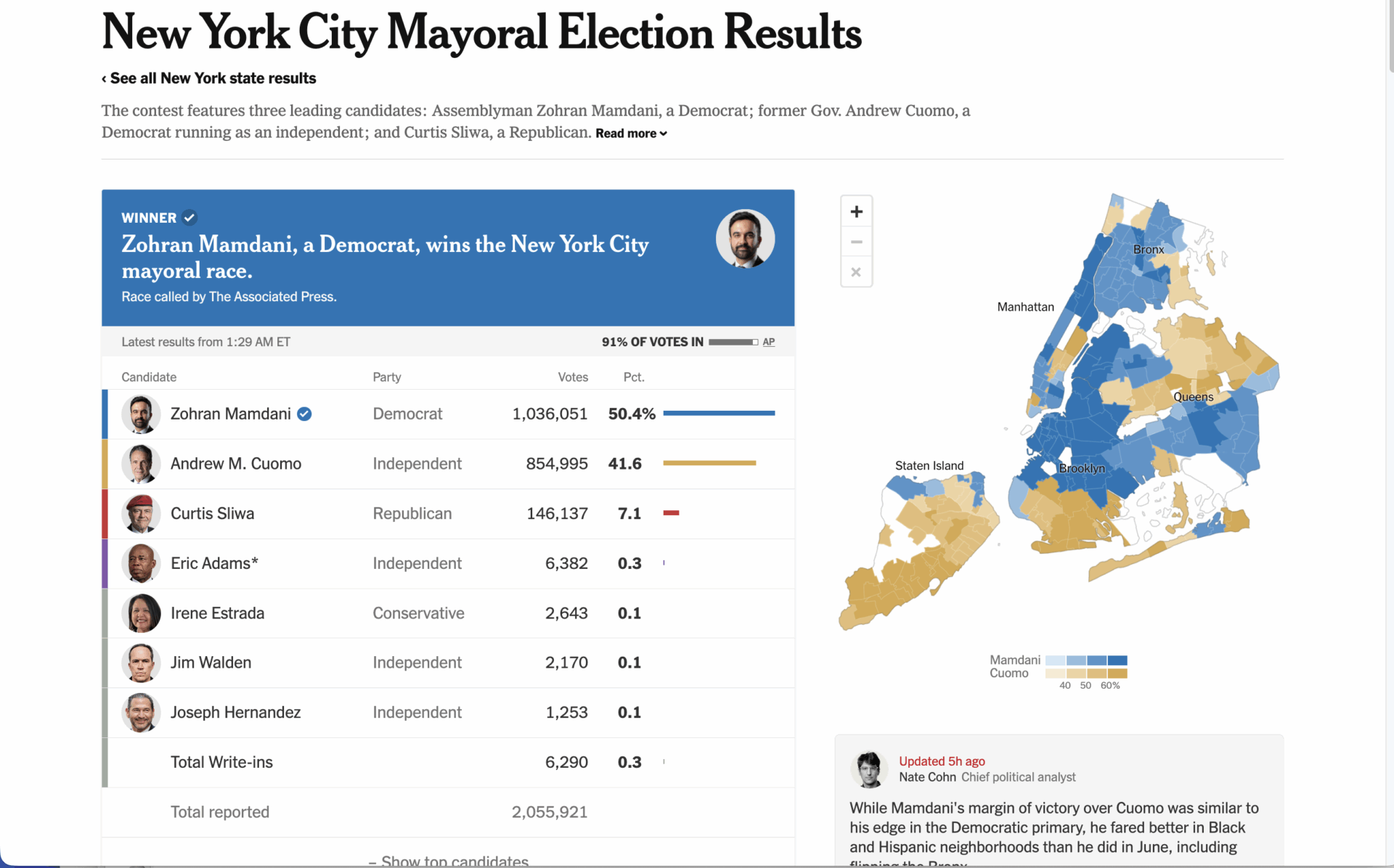 När 91 procent av rösterna räknats leder Zohran Mamdani (D) med 50,4 procent (1 036 051 röster) före Andrew M. Cuomo (oberoende demokrat) med 41,6 procent (854 995 röster) och den republikanske kandidaten Curtis Sliwa med 7,1 procent (146 137 röster), enligt uppgifter från New York Times.