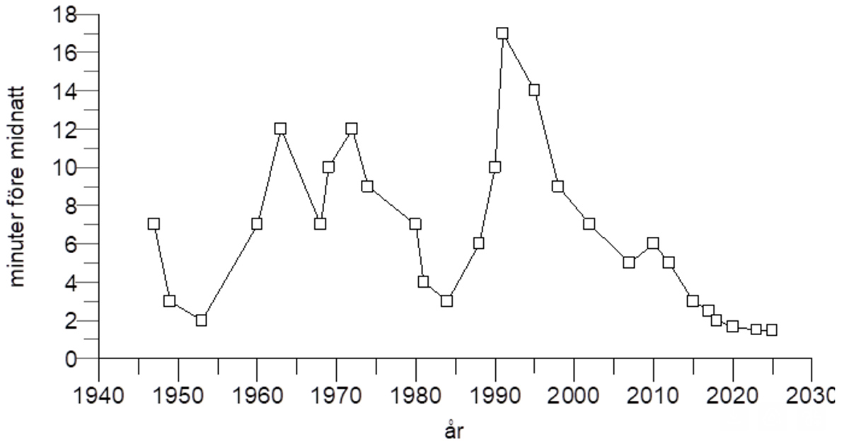 ”Domedagsklockan” står nu 89 sekunder före midnatt. 1995 var den ställd på 17 minuter i 12! Klockan är en modell som visar hur nära mänskligheten är att utplåna sig själv. Den ställs i januari varje år av en grupp Nobelpristagare i fysik och andra framstående forskare i USA. Det nya klockslaget publiceras i Bulletin of the atomic scientists årsrapport.