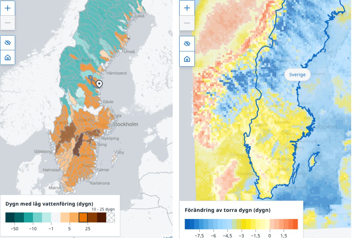 Är det då klimatförändringarna som är boven? I vilken grad klimatförändringarna spelat in den här gången är för tidigt att säga. Men i takt med uppvärmningen väntas längre perioder med låga vattennivåer i ytvatten med undantag för Norrlands inland, enligt SMHI:s prognosmodeller. Det samtidigt som de visar på ett mer nederbördsrikt klimat med häftigare skyfall. I stora delar av landet väntas också färre dagar utan nederbörd, även om förändringarna i de sydligaste delarna är små och mer osäkra. När atmosfären blir varmare kan den hålla mer vatten, konstaterar Hanna Pierrau. Samtidigt innebär det inte automatiskt mer vatten i sjöar, vattendrag och grundvatten.