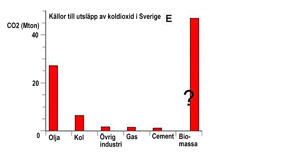 Om man ser på det officiella totala utsläppet, 38,1 Mton koldioxid för Sverige år 2024 är utsläpp från biomassaförbränning inte inräknat, medan förbränning av olja (oljeprodukter) och kol ingår som de stora utsläppskällorna. Men förbränning av biomassa släpper också ut koldioxid, och då blir klimateffekten negativ så länge inte återväxten återställs varje år. Och det gör den inte vad gäller skog. I själva verket släpper kraftverk som förbränner biomassa dessutom ut minst dubbelt så mycket koldioxid som kraftverk som använder metangas, per producerad energienhet (om man framställer el).