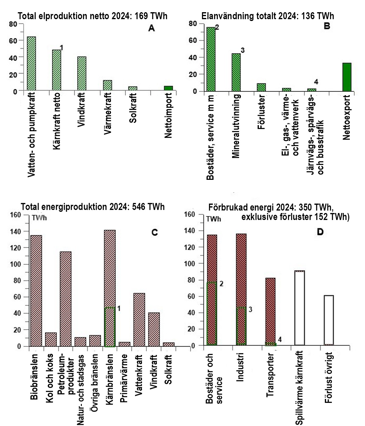 I graf A, B, C och D nedan finns data från 2024 för Sverige. Skalan i del A, B, C och D är densamma, så man kan direkt jämföra höjden på staplarna. Den totala elproduktionen var 169 TWh, graf A, medan all energi som tillfördes till energiförsörjningen motsvarade 546 TWh (graf C). Jämför man data från 2024 med data från 2023 och 2022 ses knappast någon förbättring.