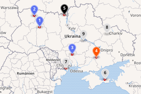 För några dagar pågick militär aktivitet även nära två kärnkraftverk i den västra delen av Ukraina (1 och 2 på kartan).