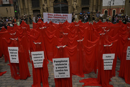 Protester mot tjurrusningen i Pamplona